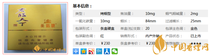 黃鶴樓君臨天下2300元/條,230元/包。香氣均勻和諧,外觀精致,因為價格較高,此前一再被網(wǎng)友拿來炒作,以致于現(xiàn)在在國內都很少有這款煙流通,外銷占比較大。黃鶴樓品種較多,口感方面也是因人而異,具體細節(jié)還是看個人習慣。