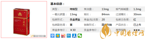 類型 :烤煙型 焦油量 :13mg 煙氣煙堿量 :1.3mg 一氧化碳量 :13mg