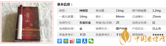 類型 :烤煙型 焦油量 :13mg 煙氣煙堿量 :1.2mg 一氧化碳量 :14mg