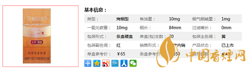 類型 :烤煙型 焦油量 :10mg 煙氣煙堿量 :1mg 一氧化碳量 :10mg