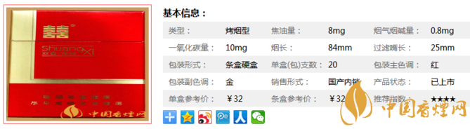 類型 :烤煙型 焦油量 :8mg 煙氣煙堿量 :0.8mg 一氧化碳量 :10mg