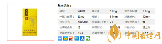 類型 :烤煙型 焦油量 :11mg 煙氣煙堿量 :1.1mg 一氧化碳量 :10mg
