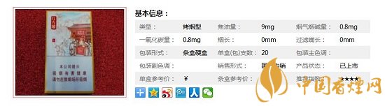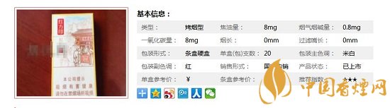 類(lèi)型 :烤煙型 焦油量 :8mg 煙氣煙堿量 :0.8mg 一氧化碳量 :8mg