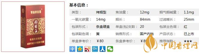 | 類(lèi)型 :烤煙型 | 焦油量 :12mg | 煙氣煙堿量 :1.1mg | 一氧化碳量 :14mg |