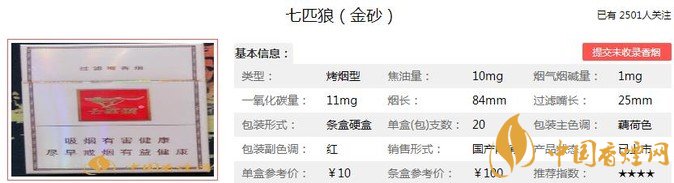 七匹狼金砂煙支長(zhǎng)84mm,過(guò)濾嘴:25mm,這款七匹狼的包裝款式簡(jiǎn)潔大方,煙氣飽滿充足,降焦不夠明顯,但是沒(méi)什么香氣,勁道適中,口感比較一般,入口有點(diǎn)雜氣,入喉有點(diǎn)刺激感,感覺(jué)沒(méi)什么特色,味道平和普通。下面我們一起來(lái)看七匹狼金砂的參數(shù)信息:焦油量:10mg 煙堿量:1mg 一氧化碳量:11mg