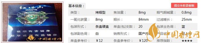 類型 :烤煙型 焦油量 :8mg 煙氣煙堿量 :0.8mg 一氧化碳量 :8mg