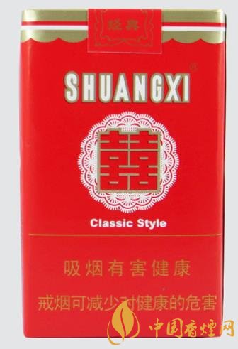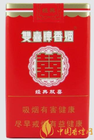 正面剪紙圖花潔白,“喜喜”則浮貼其上,嵌以金邊,喜氣洋洋。上為中文商標(biāo)“雙喜牌香煙”,下有“經(jīng)典雙喜”字樣,金線之下為大警語(yǔ)。煙支入眼,樸素清秀,豎紋煙紙上印有紅色“喜喜”,金葉兩側(cè)環(huán)繞,下有“01”字樣。濾嘴稍短,下鑲金圈,整體感覺(jué)有種典雅之秀氣。