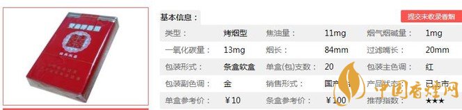 | 類(lèi)型 :烤煙型 | 焦油量 :11mg | 煙氣煙堿量 :1mg | 一氧化碳量 :13mg |
