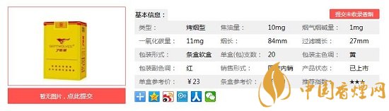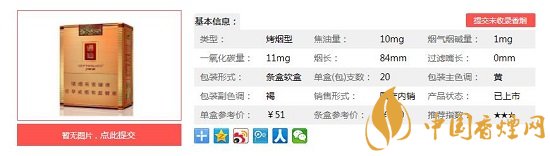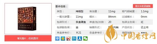類(lèi)型 :烤煙型 焦油量 :11mg 煙氣煙堿量 :1.1mg 一氧化碳量 :12mg