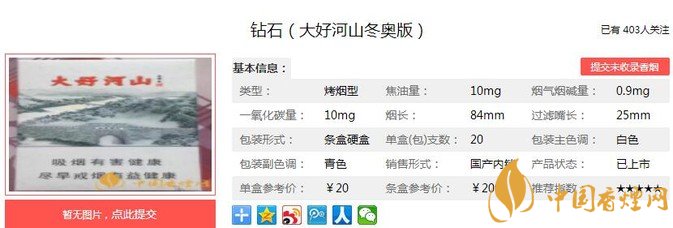 眾所周知,2022年的冬奧會(huì)舉辦城市是北京和河北的張家口。所以做為主辦城市之一的省品牌香煙,勢(shì)必會(huì)要在煙草上為冬奧做下宣傳的。這是一款非賣款,很有收藏紀(jì)念價(jià)值。但經(jīng)香煙網(wǎng)小編市場(chǎng)調(diào)查鉆石大好河山冬奧版售價(jià)為20元/包。