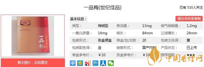 一、一品梅世紀佳品香煙價格