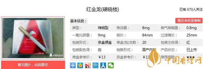 紅金龍硬曉樓具備中式烤煙的香氣特征,兼具國際流行的低焦油和淡雅口感,兼容中西優(yōu)良卷煙特質(zhì),口感醇和雅致,香氣飽滿,入口順暢。經(jīng)香煙網(wǎng)小編市場調(diào)查紅金龍硬曉樓售價為13元/包。
