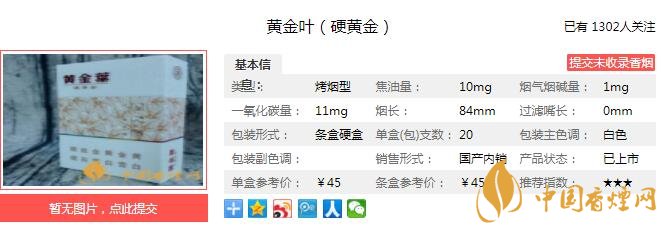 內(nèi)在設(shè)計(jì)延續(xù)黃金葉濃香品類技術(shù)特色,突出 “醇香”風(fēng)格,秉承“平衡與協(xié)調(diào)”設(shè)計(jì)理念,通過(guò)產(chǎn)品葉組配方設(shè)計(jì)、加香加料設(shè)計(jì)和卷煙材料的配套設(shè)計(jì),注重保持產(chǎn)品香氣、濃度的同時(shí),提高口感的舒適度和煙氣的輕松感。香氣醇和優(yōu)雅,煙氣凈甜舒爽,突出自然流暢,輕松愉悅。經(jīng)香煙網(wǎng)小編市場(chǎng)調(diào)查黃金葉硬黃金售價(jià)為45元/包。