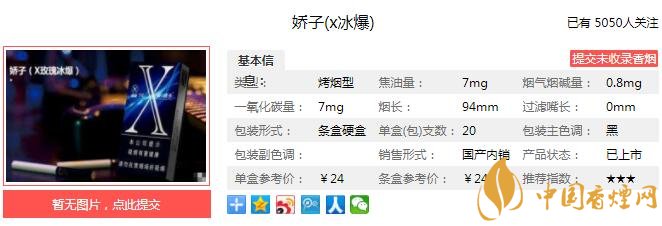 天然薄荷香精的組配和鎖香緩釋技術(shù),突出薄荷天然的清涼感受,煙草香氣與薄荷香氣協(xié)調(diào)一致,口感清涼,余味舒爽干凈,提升消費者清爽冰涼的體驗感和記憶感。經(jīng)香煙網(wǎng)小編市場調(diào)查嬌子X冰爆售價為24元/包。