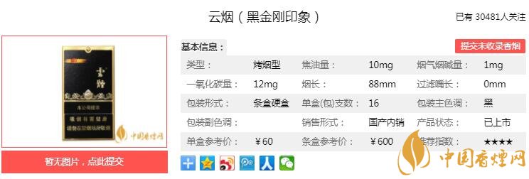 以上便是由香煙網(wǎng)小編為大家介紹的關(guān)于云煙(黑金剛印象)16支價格 云煙黑金印象多少錢的相關(guān)信息,想要了解更多有關(guān)內(nèi)容請點擊:御貓(瑞草)新品上市 添加靈芝精華素口感更醇和