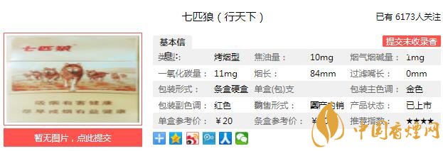 七匹狼行天下煙支長84mm,過濾嘴長34mm,卷紙采用橫紋結構,以手捏之,柔軟而充滿彈性。以鼻嗅之,煙草本香氣息不濃,夾雜著果木之香的氣味,充斥著鼻翼。下面我們一起來看七匹狼行天下的參數(shù)信息:焦油量:10mg 煙堿量:1.0mg 一氧化碳量:11mg