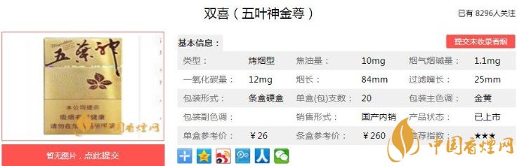 大家都知道,在當(dāng)年五葉神在全國(guó)可以說是非常的火熱,引領(lǐng)降焦減害潮流。不僅僅香氣十分突出,品牌效應(yīng)也是非常不錯(cuò)的。雙喜(五葉神金尊)在香煙品牌當(dāng)中也算是打下了一片江山。下面跟著香煙網(wǎng)小編一起來了解雙喜(五葉神金尊)的相關(guān)信息吧。