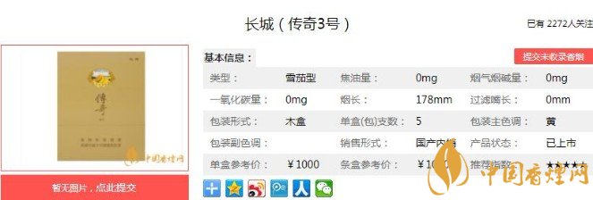 傳奇3號走的是精品路線,純手工制作,每根都是力求最好,抽起來的煙氣醇和,富有感覺。下面便是長城(傳奇3號)的基本參數(shù):焦油量:中,木盒(每盒5支,每條1盒):長度 178mm,直徑 18.7mm,環(huán)徑 58.7mm.