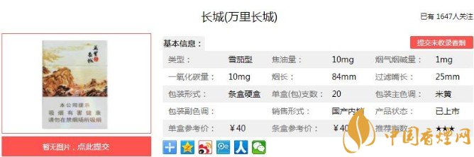 長(zhǎng)城(萬(wàn)里長(zhǎng)城)采用特制嘴棒,雪茄的焦油量一般都標(biāo)的是焦中,這款萬(wàn)里長(zhǎng)城卻標(biāo)的是10mg,可以說(shuō)是一大創(chuàng)新之處。下面便是長(zhǎng)城(萬(wàn)里長(zhǎng)城)的基本參數(shù):焦油量:10mg 煙堿量:1.0mg 一氧化碳量:10mg.