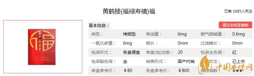 福祿壽喜代表著吉祥安康的寓意,黃鶴樓香煙為此開發(fā)出的黃鶴樓福祿壽喜香煙,福代表幸福美滿;祿代表升官發(fā)財;壽代表健康長壽;喜代表喜事。黃鶴樓福祿壽喜價格及參數(shù)如下:
