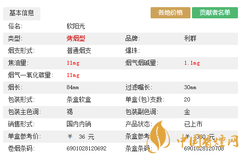類型 :烤煙型 焦油量 :10mg 煙氣煙堿量 :1mg 一氧化碳量 :12mg