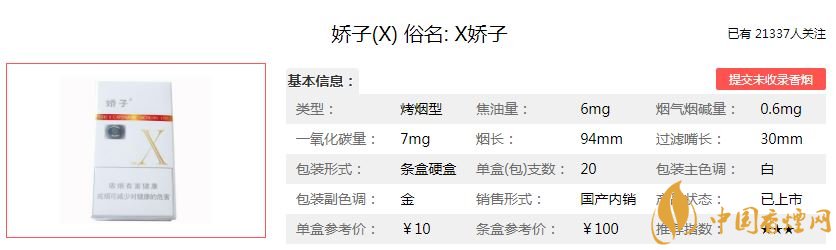 以上就是由香煙網(wǎng)小編為大家整理介紹的關(guān)于嬌子X香煙的價格的相關(guān)內(nèi)容介紹。由于各地經(jīng)濟水平不同,香煙的價格有些許差異。你所在的地區(qū)這款香煙最新價格是多少?歡迎大家在評論區(qū)留言告訴小編哦。