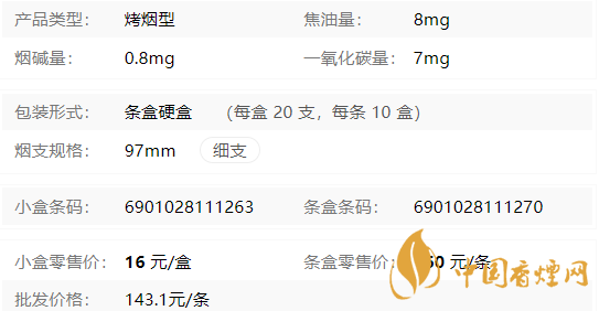 類型 :烤煙型 焦油量 :8mg 煙氣煙堿量 :0.8mg 一氧化碳量 :7mg