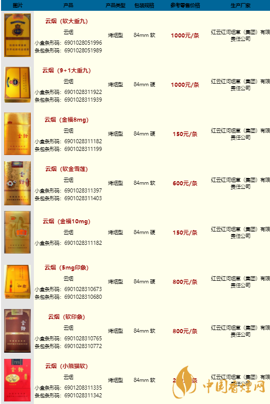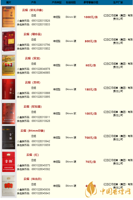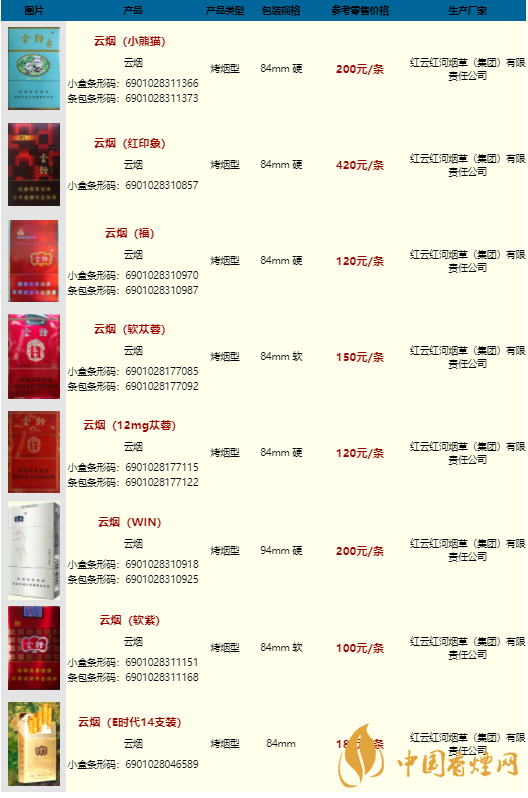 云煙香煙價(jià)格表圖大全一覽表2025價(jià)格