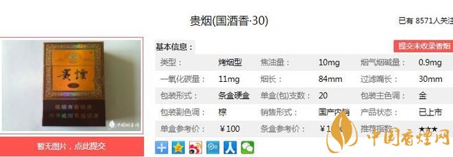 貴煙國酒香30品吸時將煙和酒兩種口感結合起來,給人一種全新的口感享受。讓業(yè)界側目的是,自貴煙(國酒香·30)率先上市后第一時間便取得了喜人銷量和良好口碑,產品供不應求。經(jīng)香煙網(wǎng)小編市場調查貴煙國酒香30售價為100元/包。