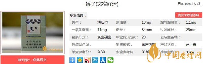 嬌子寬窄好運煙支長:84mm,過濾嘴長:34mm,采用超微植物顆粒復(fù)合濾棒,提升煙草焦甜本味,更增獨特復(fù)合香韻。下面我們一起來看嬌子寬窄好運的參數(shù)信息:焦油量:10mg 煙堿量:1.1mg 一氧化碳量:11mg