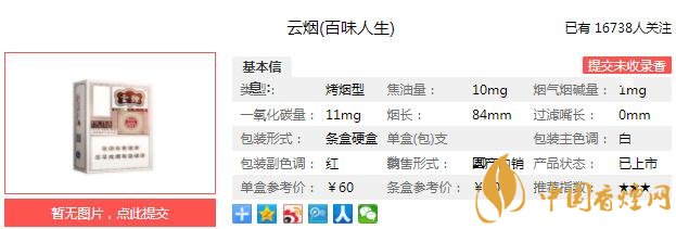 | 類型 :烤煙型 | 焦油量 :10mg | 煙氣煙堿量 :1mg | 一氧化碳量 :11mg |