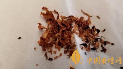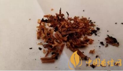 煙絲從外觀上檢視,由棕黃和明黃煙絲組成,品級不錯。煙絲切寬1mm左右。間雜切成細(xì)小圓片裝的煙梗。用料還是比較考究的。