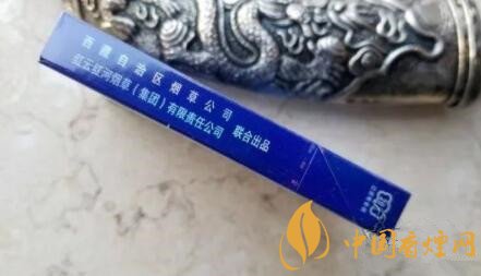 煙盒正反版面一樣,上蓋位置有雪峰日照金山,彌漫的云霧拱衛(wèi)金頂。只是細(xì)支的這個圖片質(zhì)量不太理想。煙盒的中部是金色藏文書寫風(fēng)格的“雪域”字樣。居中,有藍(lán)色的蓮花座圖案。下有銀色小字——西藏自治區(qū)煙草公司總經(jīng)銷。