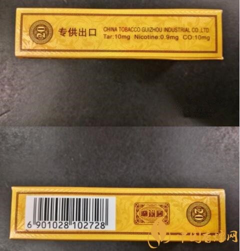 煙盒的兩側(cè)都有用到葉狀的底紋裝飾,左側(cè)用中文標注了專供出口的身份,而貴煙公司名稱和理化指標都用英文替代,焦油10mg/尼古丁0.9mg/一氧化碳10mg,數(shù)值不高不低。右側(cè)則印著中文的國酒香品名和商品條碼,掃碼并未顯示出口何地。