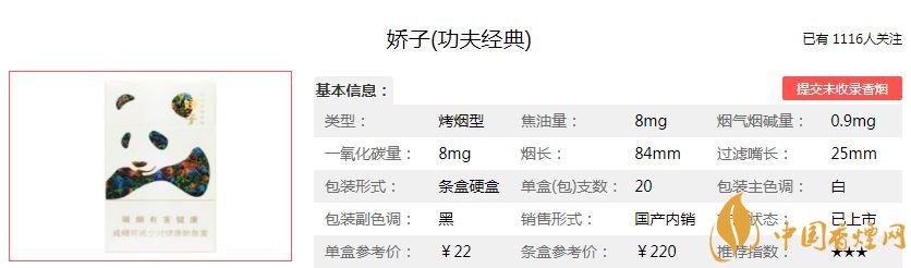 嬌子功夫經(jīng)典煙支長(zhǎng)97mm,過濾嘴長(zhǎng):25mm,“香草增香遮蓋技術(shù)”可以遮蓋煙草燃燒后吸附在身體、室內(nèi)、車內(nèi)的煙味,同時(shí)凸顯出煙草與甜香草協(xié)調(diào)的香味特點(diǎn),較好地體現(xiàn)出香味型中式卷煙創(chuàng)新產(chǎn)品特色。下面我們一起來(lái)看嬌子功夫經(jīng)典的參數(shù)信息:焦油量:8mg 煙堿量:0.9mg 一氧化碳量:8mg
