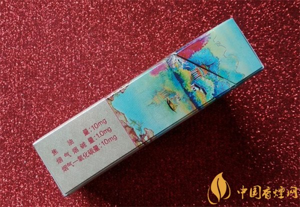 盒右側(cè)標(biāo)注著明確的理化值,1.0mg煙氣煙堿量,10mg焦油量,10mg煙氣一氧化碳量,上端印有夢(mèng)幻般的江南風(fēng)景圖案,風(fēng)格獨(dú)特,特別的討喜,以年輕人的審美觀來看,非常有檔次和個(gè)性,有一種獨(dú)特的韻味。