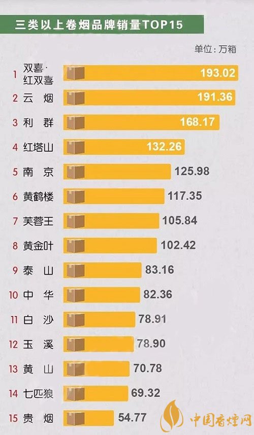 三類以上卷煙品牌銷量中,百年香煙品牌雙喜紅雙喜以微弱的優(yōu)勢(shì)位居榜首,云煙緊隨其后與排名第三的利群拉開差距。紅塔山、南京、黃鶴樓、芙蓉王、黃金葉分別位居4-8位,銷量也維持在一百萬(wàn)箱以上,泰山、中華、白沙、玉溪、黃山、七匹狼、貴煙雖然銷量在一百萬(wàn)箱一下,但都榜上有名,分別占據(jù)9-15位。一直以來(lái),三類卷煙作為全國(guó)卷煙市場(chǎng)的中堅(jiān)力量,其市場(chǎng)份額之高、覆蓋面之廣、影響力之深,始終備受行業(yè)內(nèi)外的關(guān)注。