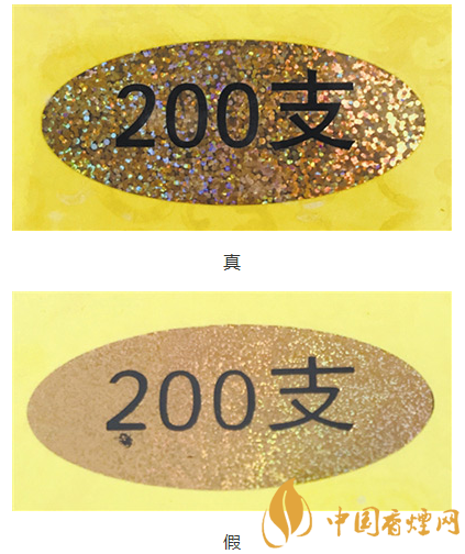 真煙條盒上的防偽標(biāo)志中的熒光顆粒大、清晰;假煙條盒上的防偽標(biāo)志顆粒小、雜亂。