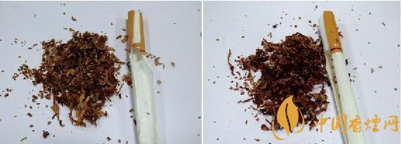真品煙絲均是從醇化好的“紅花大金元”煙葉中手工甄選出千分之一,成為“云煙(軟大重九)”的主原料,從源頭到工藝的“四級(jí)調(diào)香”體系,形成了獨(dú)具特色的津甜香,切絲寬度均勻一致且無(wú)其他雜質(zhì);假煙從原料到煙絲結(jié)構(gòu)均無(wú)法達(dá)到真品煙絲成色及摻配比例,假煙煙絲雜質(zhì)較多,與真品煙絲結(jié)構(gòu)存在明顯差異。(左真右假)