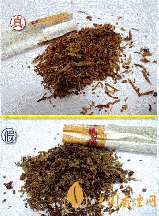 真品煙絲摻配均勻,采用獨(dú)特的“三烤”工藝,煙絲顏色呈現(xiàn)金黃色,煙絲彈性油潤(rùn)性好;假煙煙絲摻雜摻假,煙梗煙末較多,煙絲未加膨化處理,煙絲碎屑多,與真品存在顯著差異。