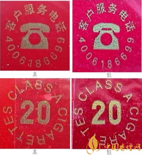 真煙的“ 電話”和“20”標識呈現(xiàn)布紋狀;假煙的“電話”和“20”標識中沒有紋路,且有漏金。