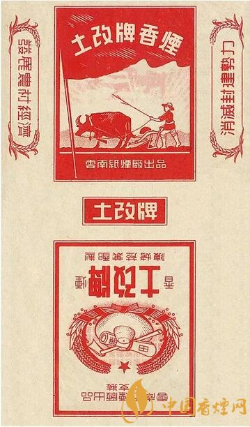 1951~1952年云南紙煙廠出品。主圖為農(nóng)民駕耕牛犁田,副圖為草帽鋤頭麥穗圍成紅色圖案,“發(fā)展農(nóng)村經(jīng)濟(jì)、消滅封建勢(shì)力”字樣,表現(xiàn)農(nóng)民第一次成為土地的主人,在田間精心勞作形象。1950年云南和平解放,1951年開展大規(guī)模的土地改革運(yùn)動(dòng)。該煙標(biāo)是中國(guó)煙標(biāo)史上少見的“土改”牌煙標(biāo)。