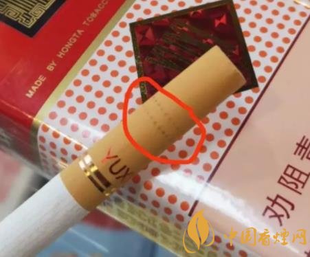 5、香煙過濾嘴上有很小的激光打孔,一般不易看見,可點燃后吸入一口煙后,用手指緊夾煙支中部,然后向煙支反吹吸入的煙氣,會留下均勻的細密孔眼。假玉溪的過濾嘴上有的沒有激光打孔,有的偽造了激光打孔,但做工粗糙,大小不一。