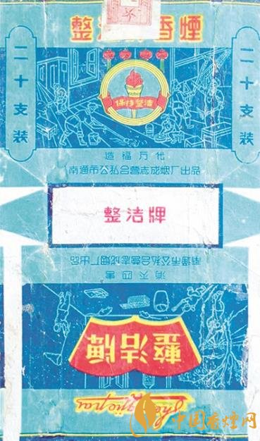 當(dāng)時(shí),南通市公私合營(yíng)志成煙廠出品了一枚“整潔牌”煙標(biāo)(如上圖)。這枚采用白描藝術(shù)手法設(shè)計(jì)的煙標(biāo),主版是一幅“造福萬(wàn)代”的主題圖案:畫(huà)面中心掛有四盞紅燈籠,下部有一把裝飾著紅綢帶、帶有“保持整潔”字樣的火炬。