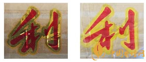 假冒卷煙:該款假冒卷煙激光全息防偽圖案暗淡無(wú)光,圖案無(wú)分層;兩側(cè)“三潭印月”都暗淡。上真下假