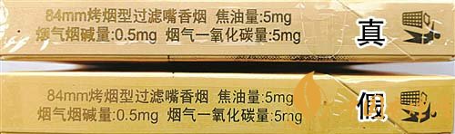2.背面商標(biāo)紙印刷工藝差異對比:真煙背面中間“花球”圖案采用壓凸?fàn)C金工藝,用手摸凹凸感明顯,且“花球”線條清晰;假煙采用高清掃描仿制印刷,中間“花球”圖案用手摸無凹凸感,且“花球”線條模糊、部分區(qū)域有粘連重疊。