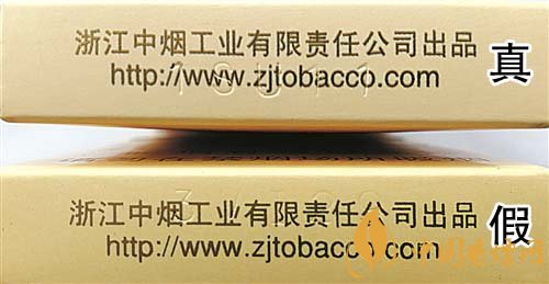 3.小盒底部鋼印差異對比:真煙鋼印為機(jī)器動態(tài)打印,整體鋼印較深、間距不等,其位置與企業(yè)網(wǎng)址重疊;假煙鋼印一般為手工靜態(tài)打印,鋼印較淺,位置與文字重疊。