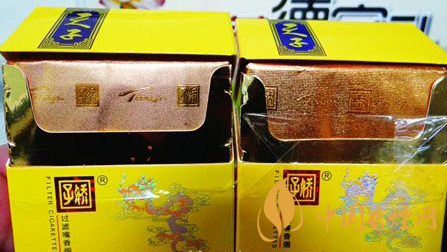 小盒商標(biāo)印刷工藝差異對比:真品小盒正面套印定位燙金“飛龍”圖案鱗片清晰,從頭至尾都能看到定位燙金工藝,紅色貫穿整個龍身,“鱗片”是雪里透紅,栩栩如生;假煙套印定位燙金仿制較差,鱗片無法達(dá)到真品的印刷工藝水平,印刷工藝與真品商標(biāo)圖案差異明顯。