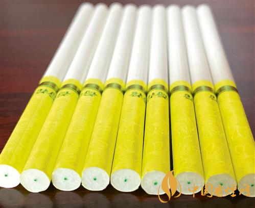 觀察煙支。真品煙支長度為97mm,接裝紙長度為36mm,嘴棒長度為30mm。接裝紙為黃綠色,帶燙金“荷花”字樣及整圈燙金花紋,使用專版小方格卷煙紙,內(nèi)置加香亮鮮綠線醋酸濾棒,煙支端口平齊無毛茬。